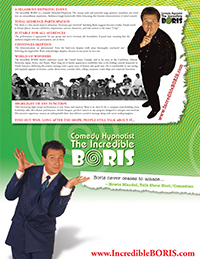 Boris Cherniak is a renowned comedy hypnotist and keynote speaker. This page is designed to provide you with all the essential resources and information you need to explore and book Boris for your upcoming event. Brows through brochures, which offer an in-depth overview of Boris's captivating performances, highlighting his unique blend of comedy, hypnosis, and motivational speaking.